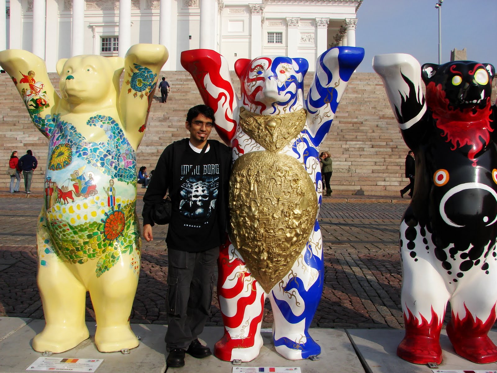 Sur cette place, on peut y observer plein d'ours en train de lever les pattes avant. Ce sont des buddy bears. Il y en a 142. Chacun des ours représente un pays membre des nations unies. Le but de cette opération est de promouvoir la tolérance entre toutes les nations.
